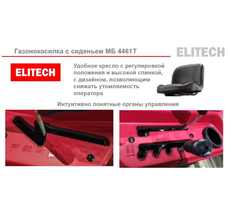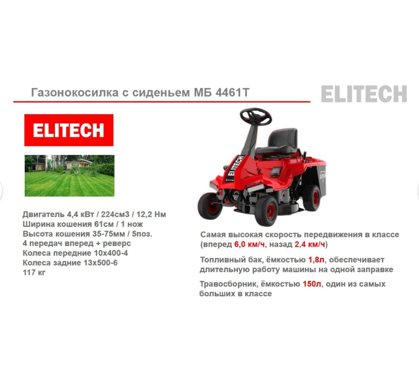 Газонокосилка с сидением ЕLIТЕСН МБ 4461Т предназначена для кошения травы на специально подготовленной поверхности (газон, лужайка, поле для игр и т.п.) с уклоном не более 10 градусов.