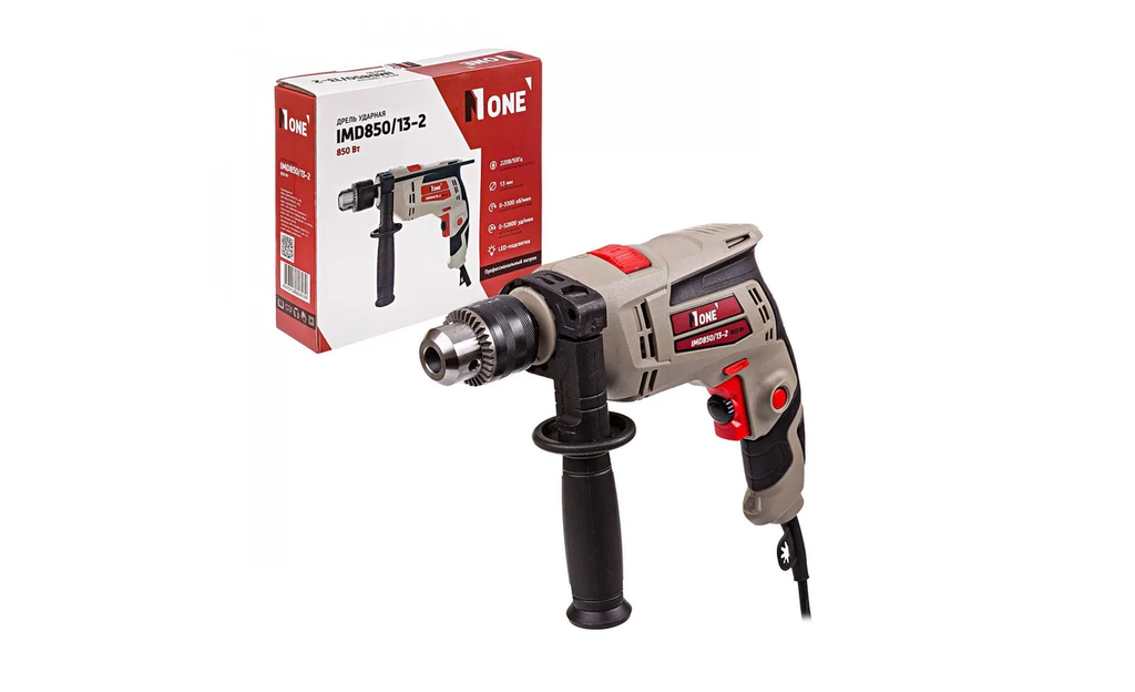 Сетевая ударную дрeль NUMBER ONE IMD850/13-2. Дрель используют в домашних мастерских или на небольшом производстве для сверления металла, пластика, дерева, искусственного или природного камня. Особенности конструкции и эксплуатации инструмента.Небольшой вес и размер позволяют работать дрелью одной рукой.Вентиляционные отверстия способствуют хорошему охлаждению двигателя.Есть реверс - сверло просто извлечь из бетона или камня.Установлен ключевой патрон для надёжной фиксации любой оснастки.Большая кнопка Пуск.Есть кнопка фиксации включения - безопасно работать инструментом долгое время.Есть функция удара для работы с мягким камнем и лёгким бетоном.На сетевом шнуре есть держатель для ключа.Частота вращения регулируется колёсиком на кнопке Пуск.Работает от сети 220 Вольт.Есть подсветка рабочей зоны