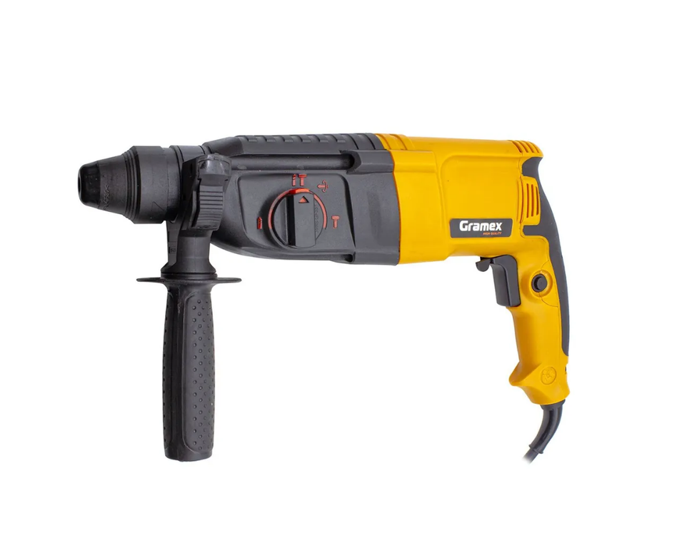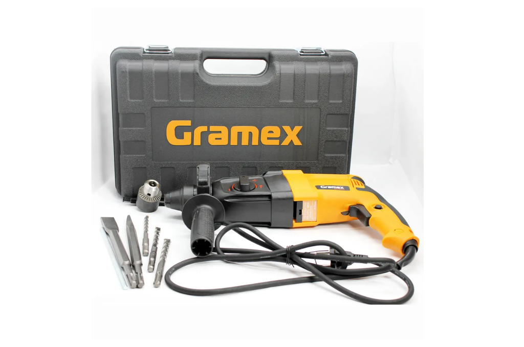 Электрический перфоратор Gramex HRH-980 работает в двух режимах: сверление с ударом, только сверление, только долбление. Данный электроинструмент настолько универсален, что вполне может заменить не только ударный молоток и дрель, но и шуруповёрт. Патрон SDS-Plus позволяет легко и просто менять насадки. Ударопрочный пластиковый корпус обеспечивает надежность и длительный срок службы инструмента. Эргономичная прорезиненная рукоятка способствует надежному удержанию инструмента. Снабжён реверсом.