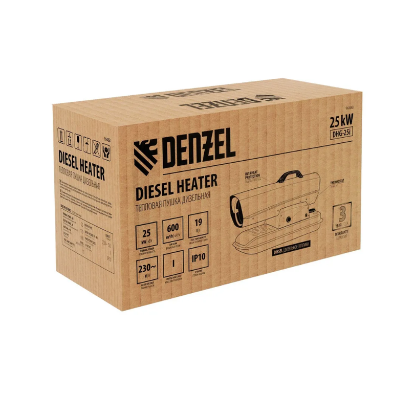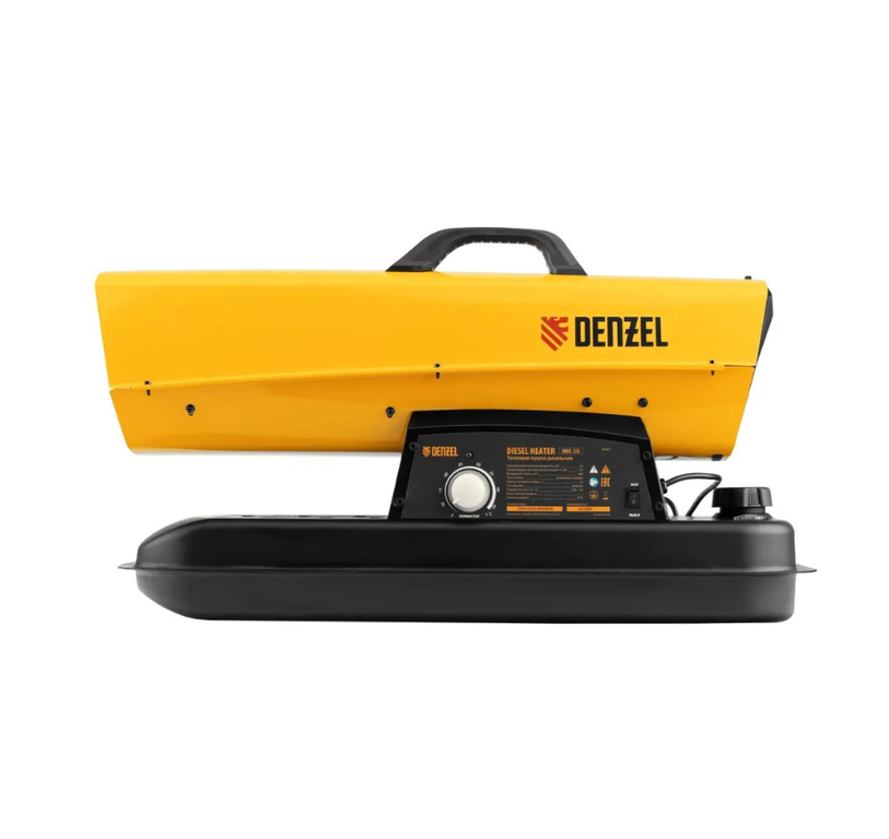 Дизельная тепловая пушка DENZEL DHG-25i, 25 кВт, 250 м2, с расходом воздуха 600 м3/ч, прямым нагревом, защитой от перегрева, цифровым термостатом и трансформатором розжига, теплогенератор