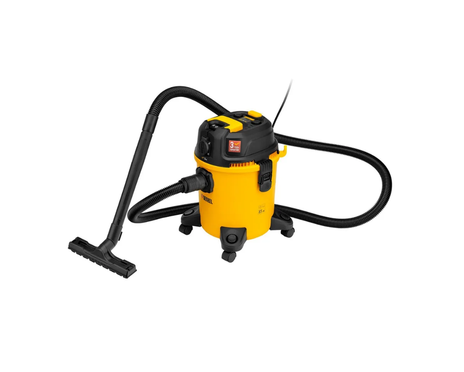 Пылесос для стройки Denzel RVC20 28202 мощностью 1400 Вт, с баком объемом 20 л и шлангом длиной 3 м, оснащен розеткой с автосинхронизацией и предназначен для уборки бетонной, кирпичной пыли, опилок, стружки и других твердых отходов. Функция влажной уборки позволяет собирать воду с пола. К пылесосу можно подключить электроинструмент, чтобы минимизировать количество пыли, образующейся в результате пиления, сверления, фрезерования. Техника используется во время проведения строительных и ремонтных работ, будет полезен для поддержания чистоты в мастерской, гараже, производственном помещении.