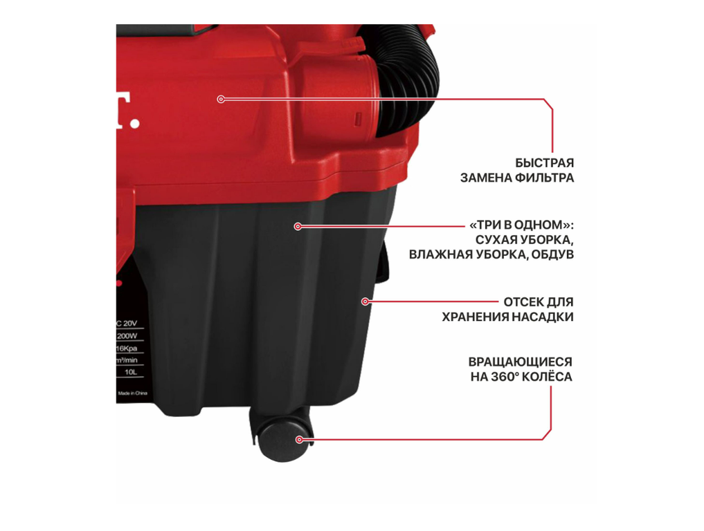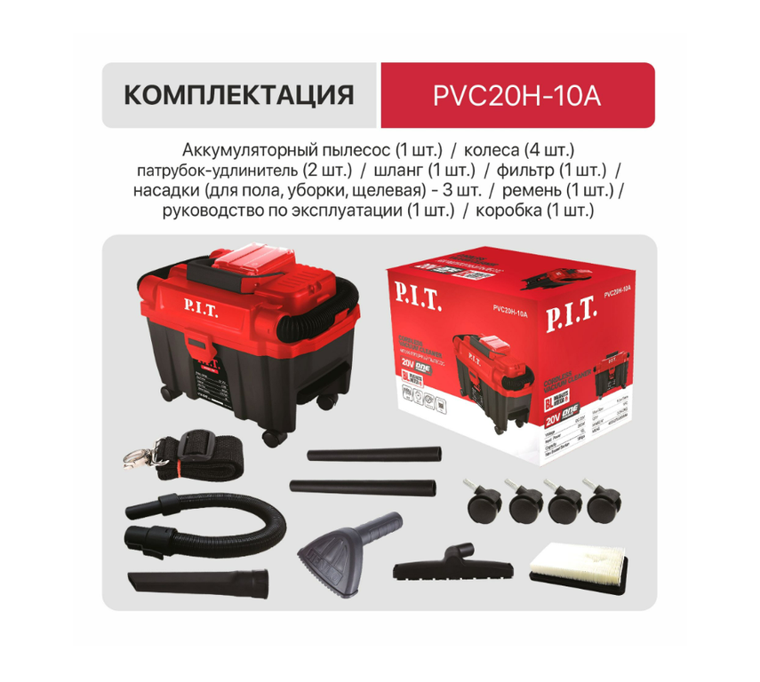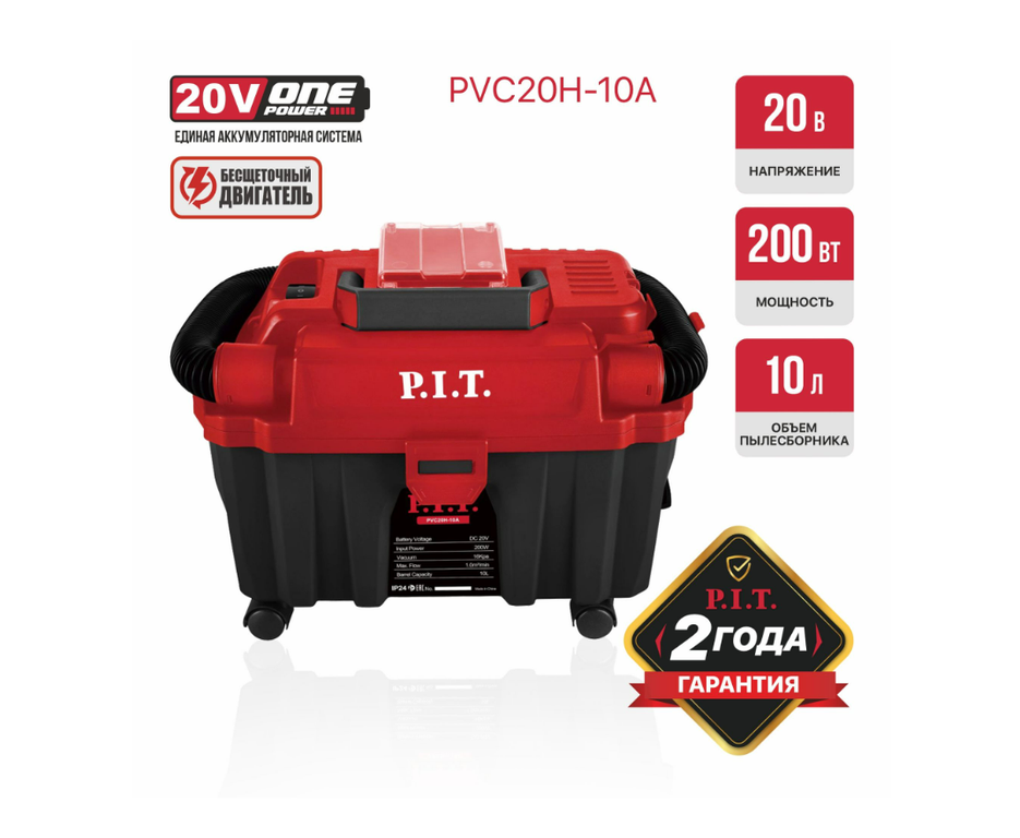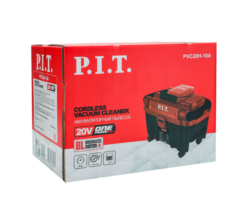 Строительный пылесос аккумуляторный бесщёточный P.I.T. PVC20H-10A SOLO (20В, 10л, 1 м³/мин, 3в1: сух/влаж уборка, выдув).