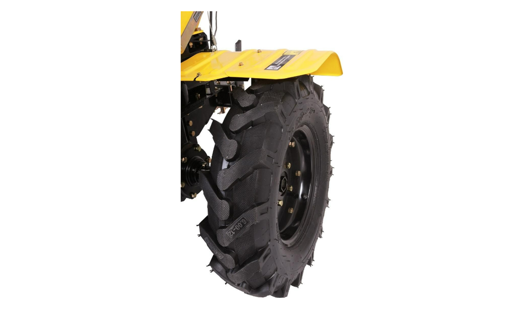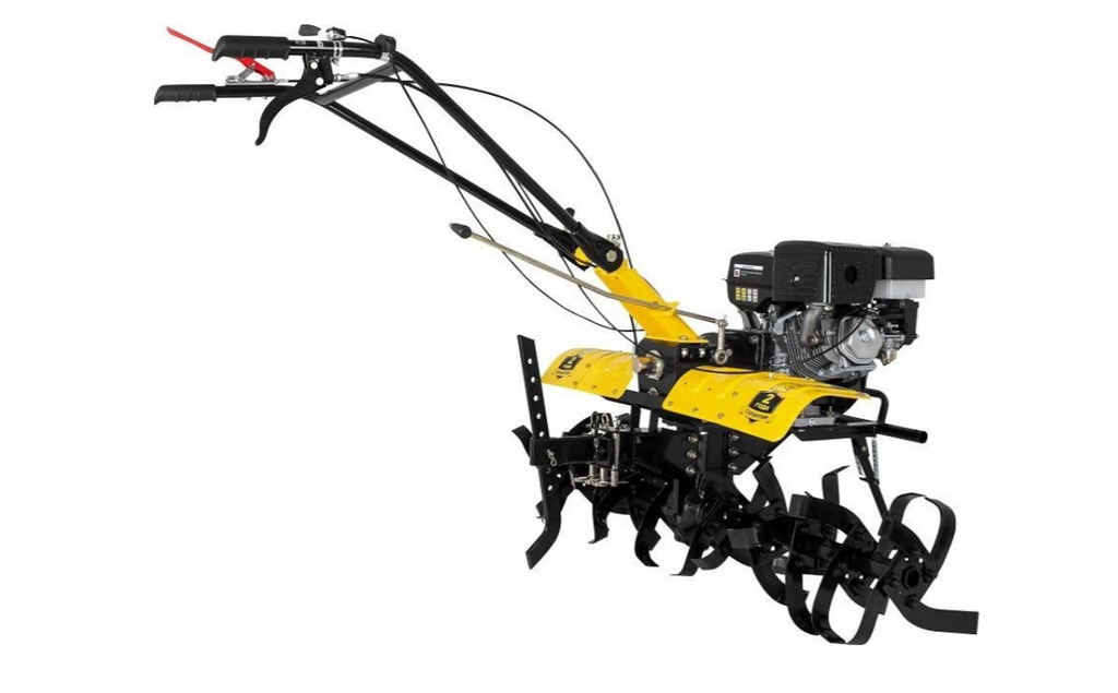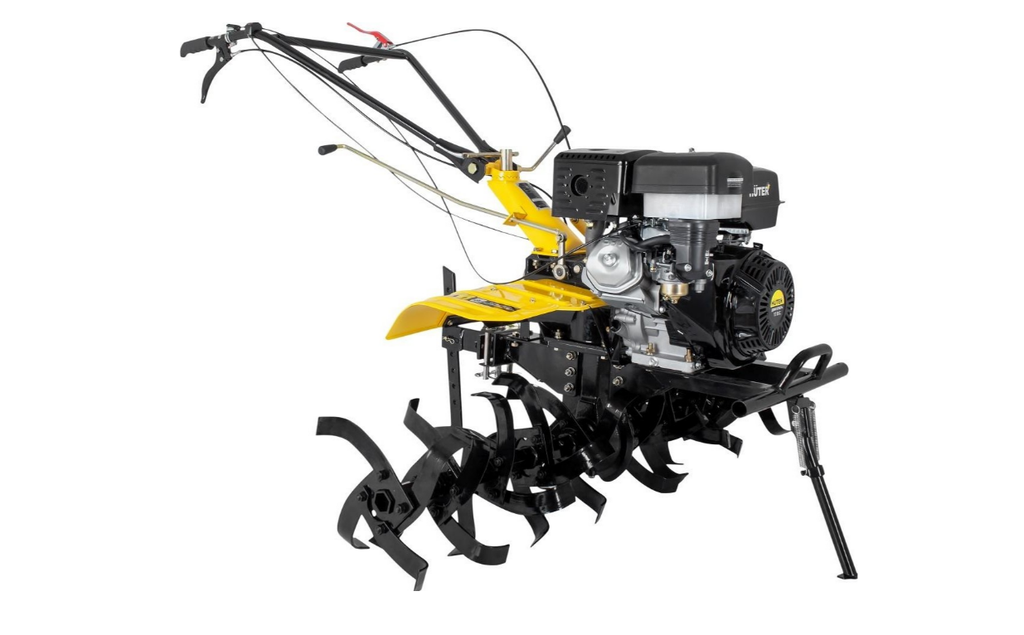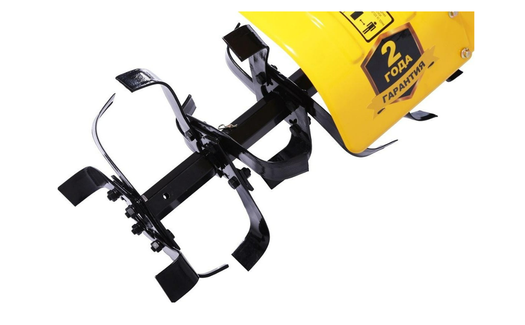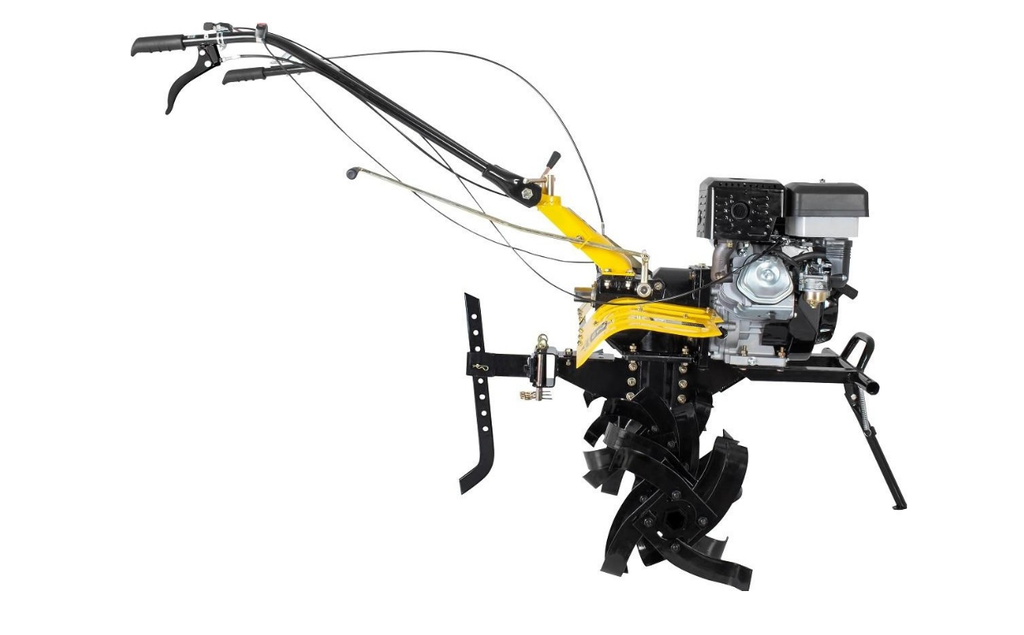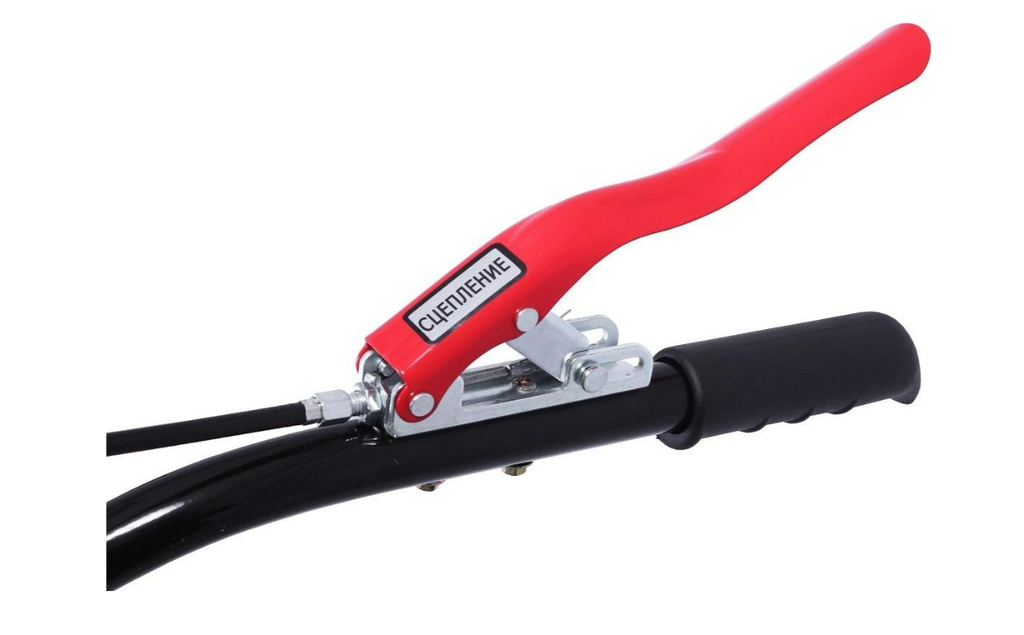 Фрезы закрыты защитными крыльями, поэтому комья земли и пыль не полетят в оператора машины. Управление мотоблоком вынесено на рукояти.