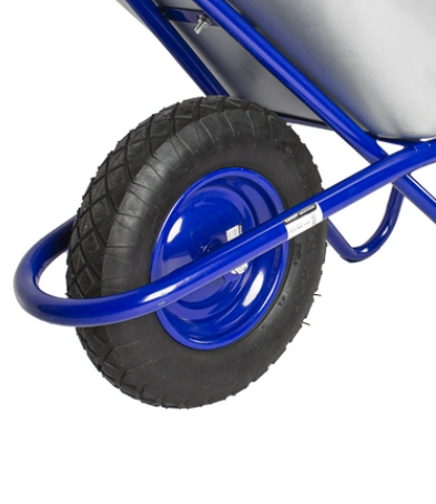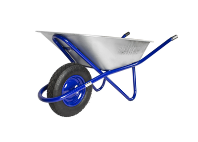 Одноколесная тачка строительная, объем корыта 100 л, толщина стенки корыта 0,8 мм, вес 180 кг, колесо 4.00-8/16. Синяя рама, синее колесо.