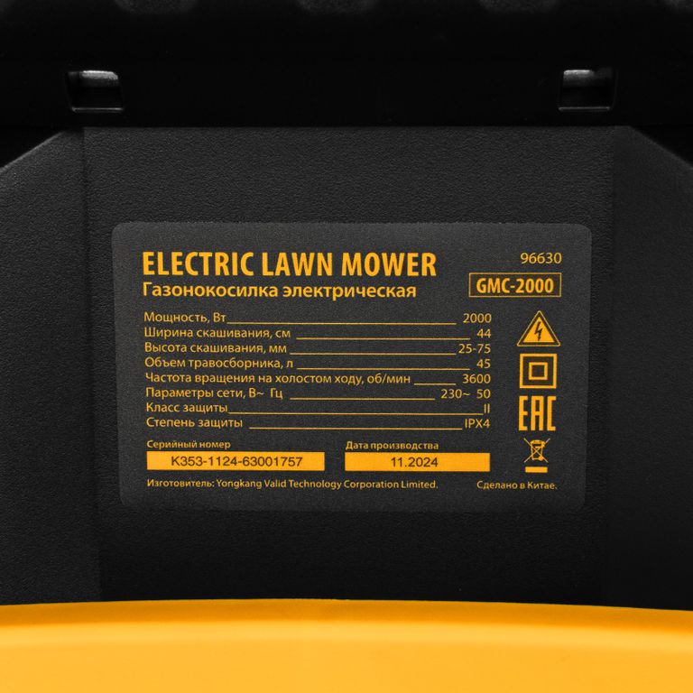 Ширина обработки 44см, мощность 2000 Вт, 6 уровней высоты кошения , травосборник 45 л