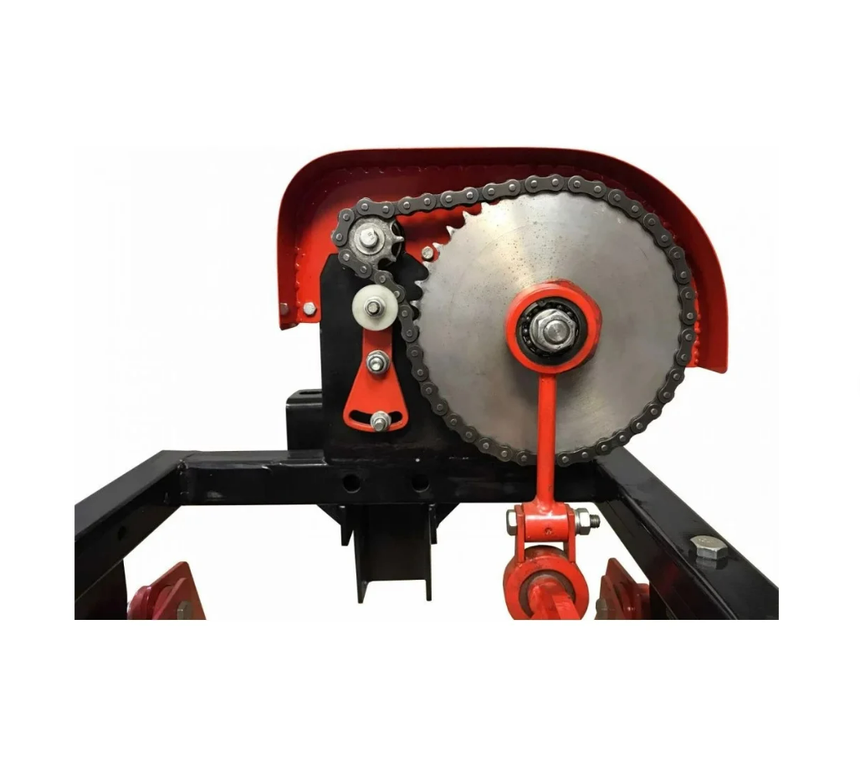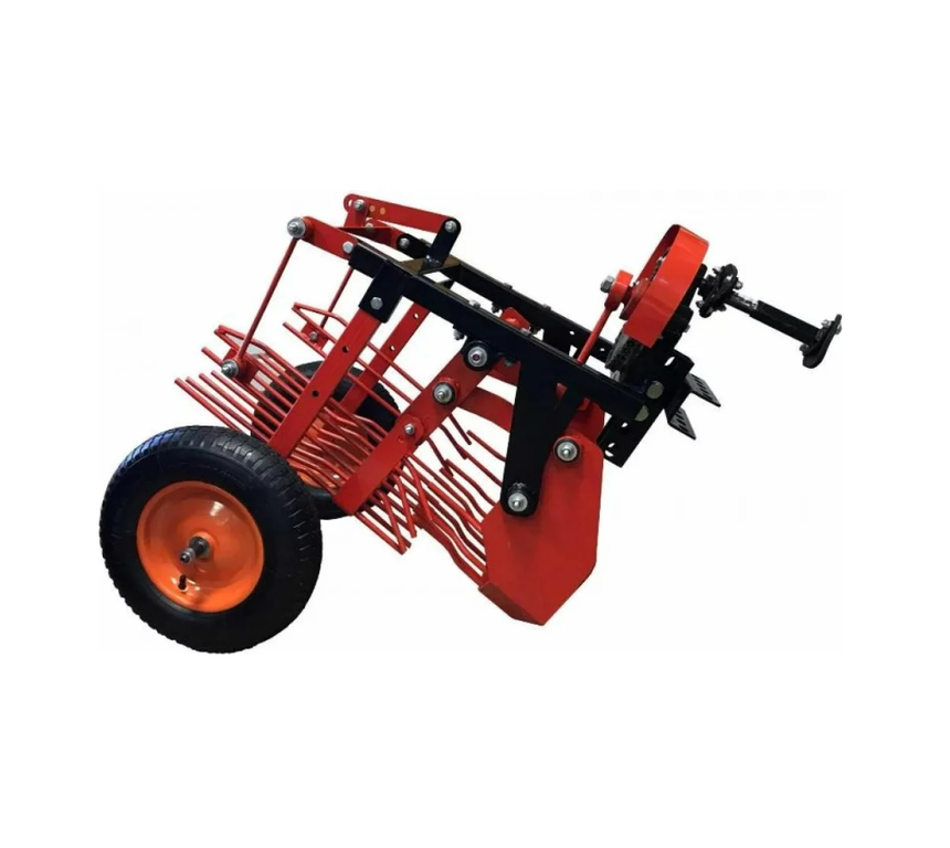 Картофелекопалка вибрационная предназначена для механизированного выкапывания клубней картофеля из земли, укладывания на поверхность для дальнейшего ручного собирания. Кроме этого, механизм можно использовать для собирания лука, свеклы, чеснока. Машина рассчитана на уборку картофеля при ширине междурядий 60-70 см. Для увеличения сцепного веса необходимо навесить спереди на штангу мотоблока груз не менее 50 кг. Привод осуществляется через телескопический кардан с мягкими резиновыми муфтами. При такой конструкции допускаются перекосы мотоблока относительно копалки. Звезды и цепь установлены на раму картофелевыкапывателя, что сделало невозможным какие-либо перекосы и как следствие, слетание цепи во время ее эксплуатации.