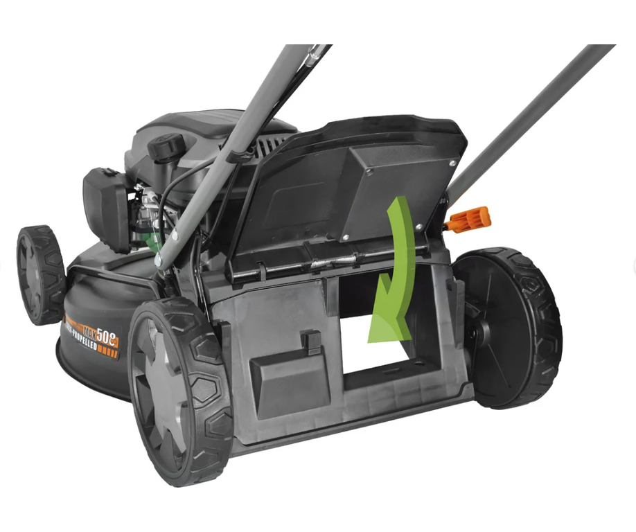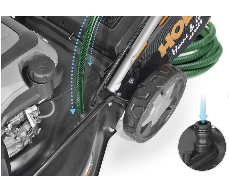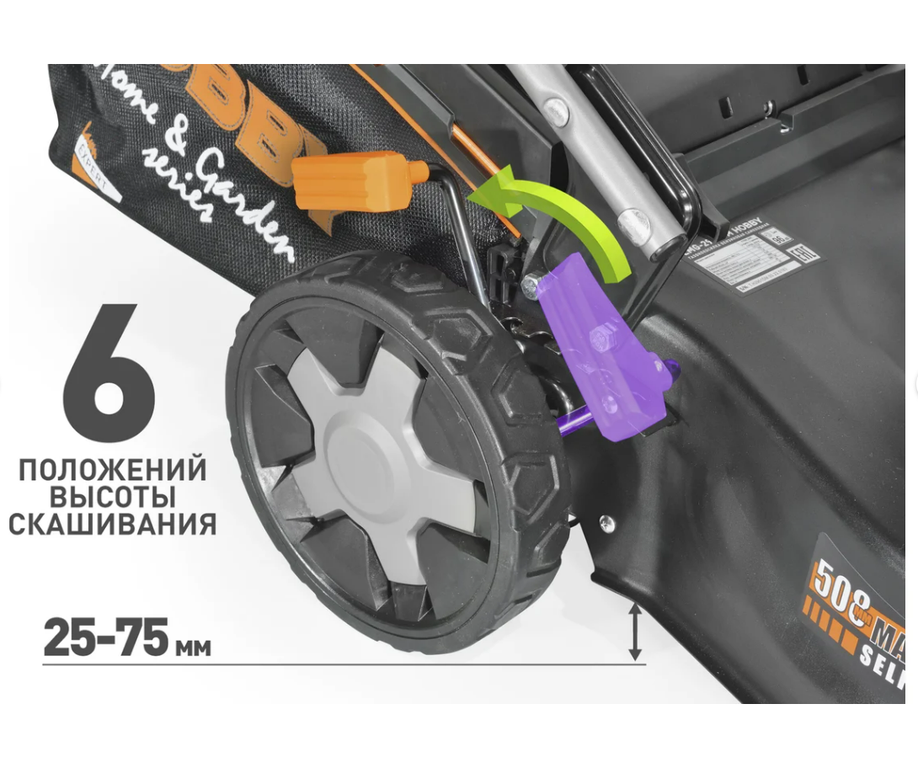Регулировочный рычаг позволяет с легкостью выбрать необходимую высоту стрижки в диапазоне от 25 до 75 мм, что позволяет привести газон к желаемому виду.