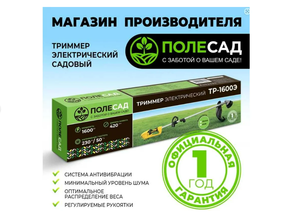 Триммер ПОЛЕСАД ТР-1600Э оснащён надёжным и неприхотливым электрическим двигателем мощностью 1600 Вт, обеспечивающим высокую производительность покоса. Работая от сети, электрический триммер безопасен для экологии на участке и обеспечивает минимальный уровень шума при работе. Электрический привод расположен в верхней части устройства, что обеспечивает оптимальное распределение веса и удобство работы.