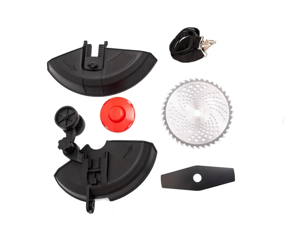 Комплектация: триммер. защитный кожух для ножа, защитный кожух для катушки триммерной , катушка триммерная, нож, АКБ,. ЗУ руководство по эксплуатации