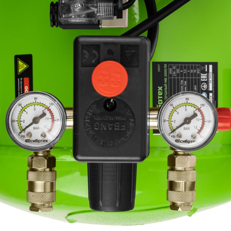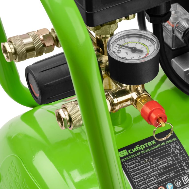 Безмасляный малошумный компрессор Сибртех МБ 2000/50 58007 мощностью 2000 Вт и объемом ресивера 50 л имеет производительность на входе 300 л/мин и сжимает воздух под давлением до 8 бар. Используется для обеспечения функционирования пневмоинструмента, например, краскораспылителя, перфоратора или пневматического шуруповерта. Для работы устройства не требуется масло, поэтому воздух на выходе не содержит его частиц. Компрессор оптимален для проведения покрасочных работ и продувки электронных компонентов.; Одна из ключевых особенностей компрессора — низкий уровень шума (не превышает 70 дБ), позволяющий использовать устройство в жилом помещении без дискомфорта для людей.